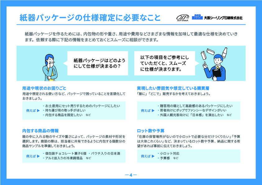 環境配慮の面からも注目度が上昇中の紙器パッケージ。はじめは1枚の紙ですが、その可能性は無限大です。スタイリッシュ、女性らしい、ポップなどの意匠性を表現することはもちろん、ロック機能や開けやすさといった機能性、また、現状のパッケージや売り場に付け足して付加価値をプラスすることもできます。 内包する商品・個数とかんたんなご要望でご提案も可能でございます。 詳細は紙器パッケージ作り方ガイドをご覧くださいませ。