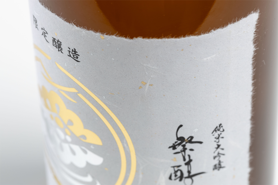 金箔・銀箔をちりばめた耐摩耗性の高い(※)和紙に、ちぎり加工を施した華やかなラベルです。上質な風合いと、金銀箔の現れ方は一枚ずつ異なるため、プレミアム商品の特別感をより一層引き立てます。お祝いの贈答品や記念品など特別な銘柄に適しています。