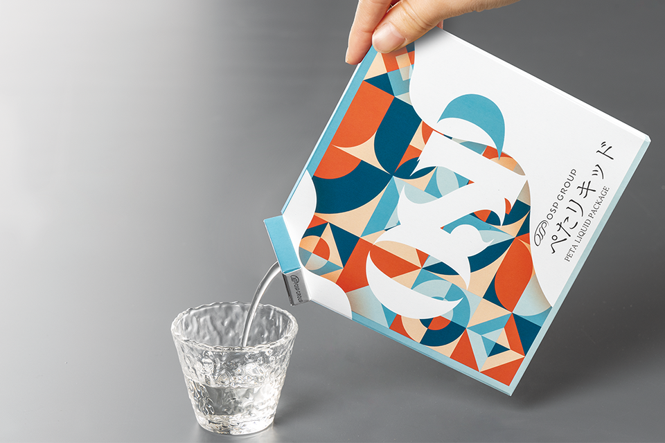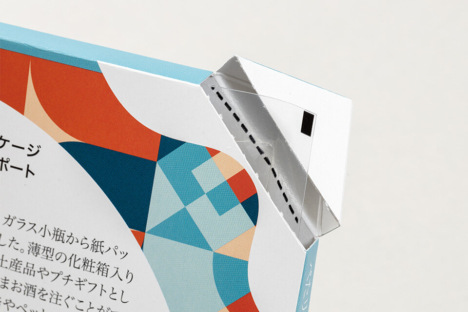 薄型パウチ袋に充填した日本酒を、紙製パッケージで包装します。 瓶に比べ軽量で、持ち運びが容易なうえに割れないことから、国内外問わずお土産市場に向けて展開するアイテムに適しています。