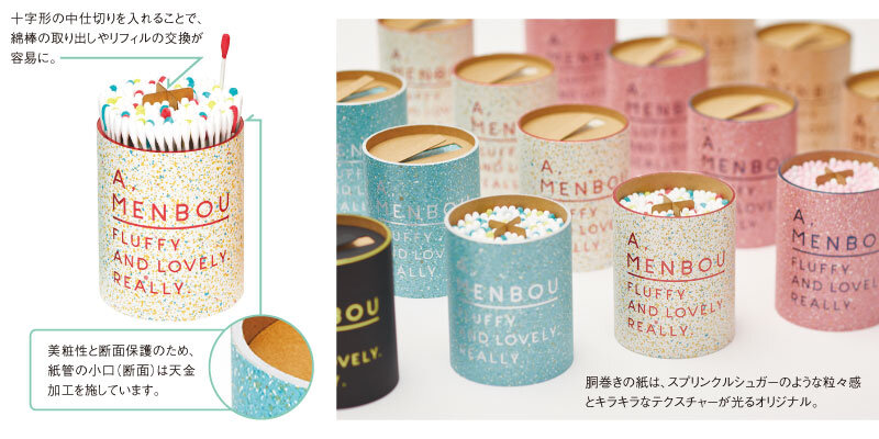 簡易なプラスチック容器が主流の綿棒パッケージは見た目のおしゃれさや詰め替えの習慣がなく、使い捨てされるもの。しかし、綿棒はもっと可愛くなれる!可愛くなれば捨てたりしない!と考えて生まれたのが、部屋に置きたくなるAクラスの綿棒「A,MENBO」です。現状のプラ容器とイメージが近い紙管で、蓋のタブを引っ張って開封。容器も中身もカラフルで、日常にウキウキをもたらします。