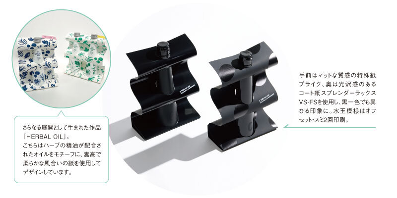 瓶を守る緩衝材として一般的なのは、“プチプチ”と呼ばれる気泡緩衝材。確かに衝撃から守ってくれますが、袋や箱から取り出した最初の印象が損なわれるのは否めません。そこで、紙一枚を使って複雑ではなくデザイン性のある緩衝材ができないか?と考えたのがこちら。一枚の紙を瓶が突き抜けているかのような見た目のインパクトある波状スリーブが衝撃を吸収し、このままショッパーに入れて持ち運ぶことができます(意匠登録済み)。真っ黒のデザインは、80年代初頭のパリコレで発表され時代を切り開いた黒い装いへのオマージュを込めて。