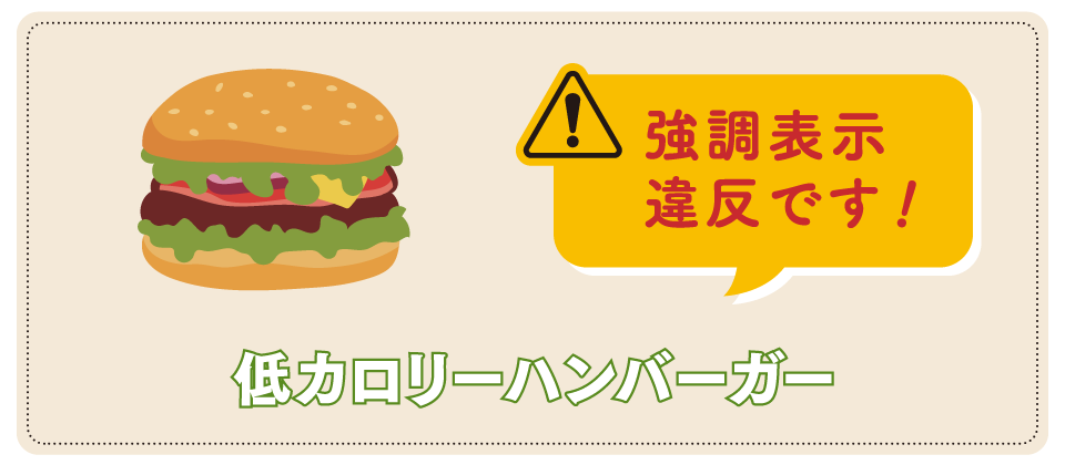 具体的に「○○バーガーより〇kcal オフ」という表示ならOKですが、他社製品との比較は難しいもの。実際は自社の従来品と比較して、「当社比でカロリー〇%OFF」といった表示がよく見られます。