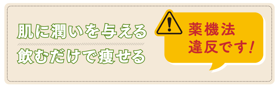 飲む人を応援する訴求表現ならOK。一般的に「肌の美容を望むあなたに」「ダイエットのサポートに」など、直接的な表現を避けた言い回しが多く用いられます。