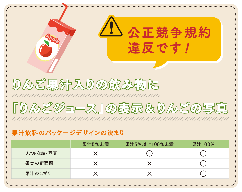 【りんご果汁入りの飲み物に「りんごジュース」の表示&りんごの写真】