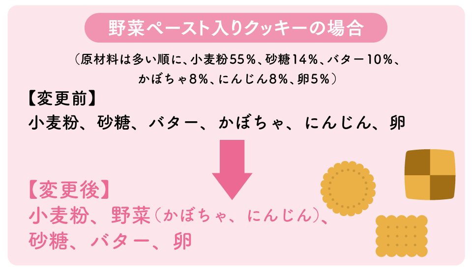 原材料名については個別に記載しがちですが、カテゴリごとの包括表示が可能なケースも。例えば下記のクッキーの場合、まとめることで全体における野菜の割合が2番手の16%となり、野菜を多く使ったクッキーであるという魅力が際立ちます。